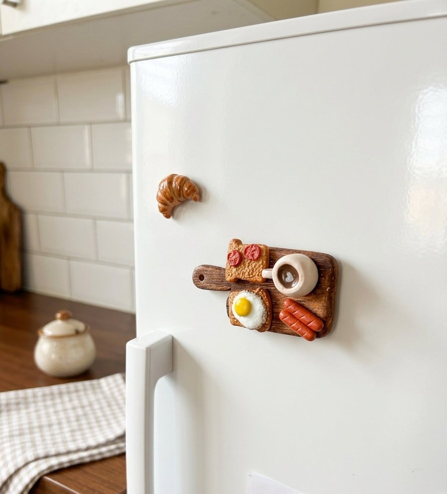 Start every morning with a smile with this incredibly detailed, hand-sculpted breakfast platter magnet. This tiny feast captures the cozy essence of a rustic brunch, featuring realistic textures and vibrant colors that make it look almost good enough to eat!