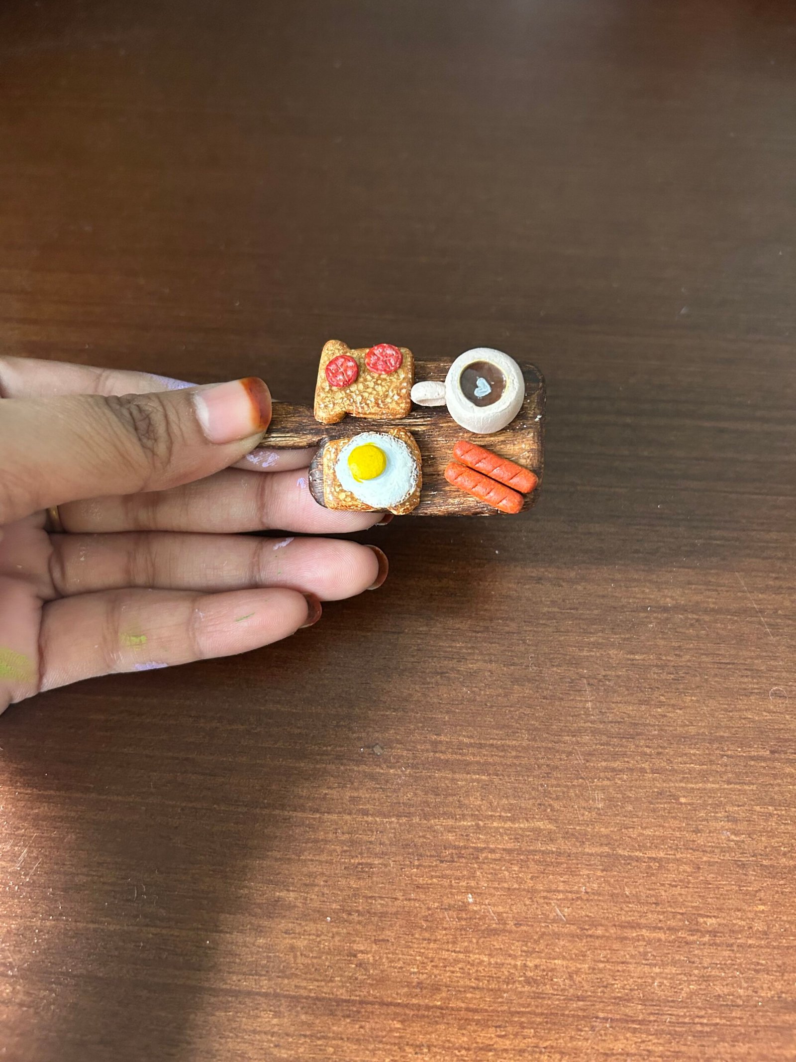 Rustic Presentation: All breakfast elements are fixed onto a miniature “wooden” cutting board base, giving it a warm, farmhouse aesthetic.