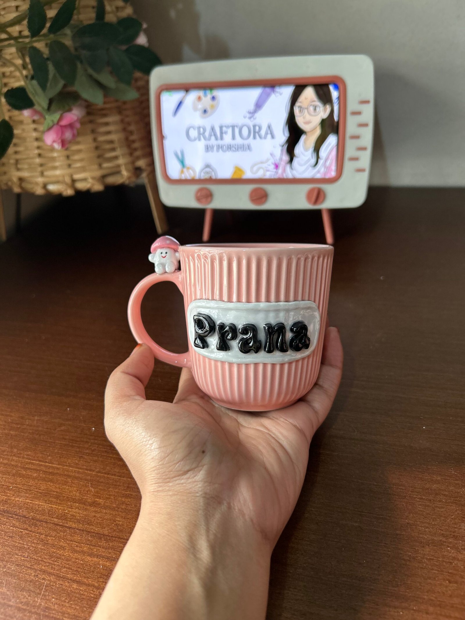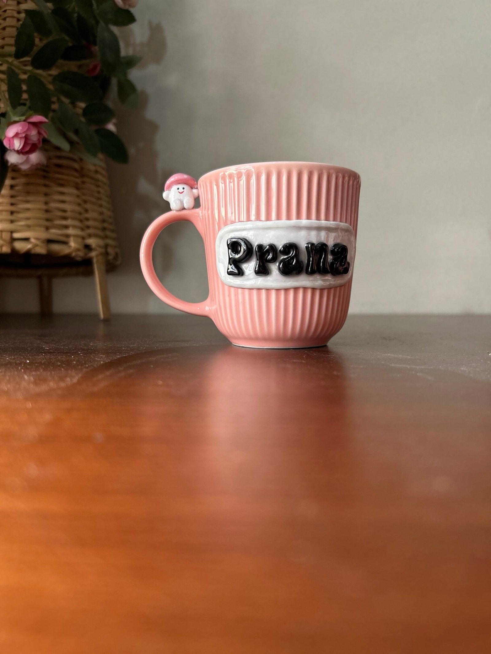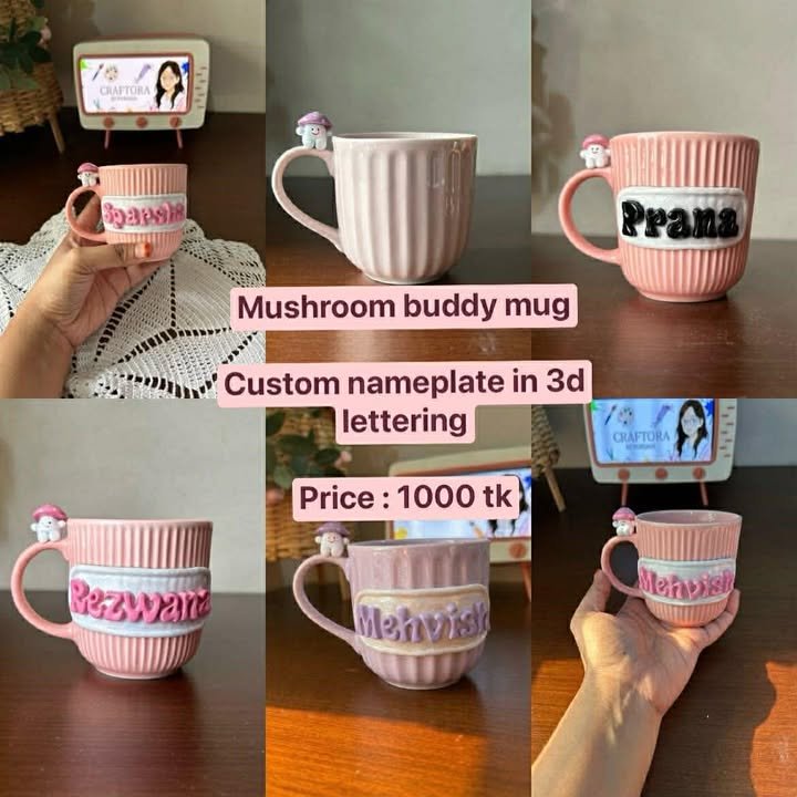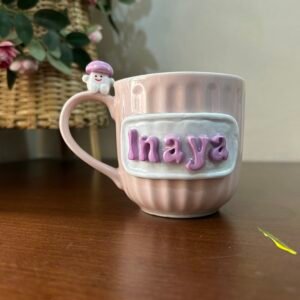 Meet the mug that’s as unique as you are! This isn’t just a cup; it’s a handcrafted piece of art designed to bring a smile to your face with every sip. Featuring a beautifully textured, ribbed ceramic body in a soft blush pink, this mug is elevated by a custom 3D nameplate and a tiny mushroom friend perched right on the handle.
