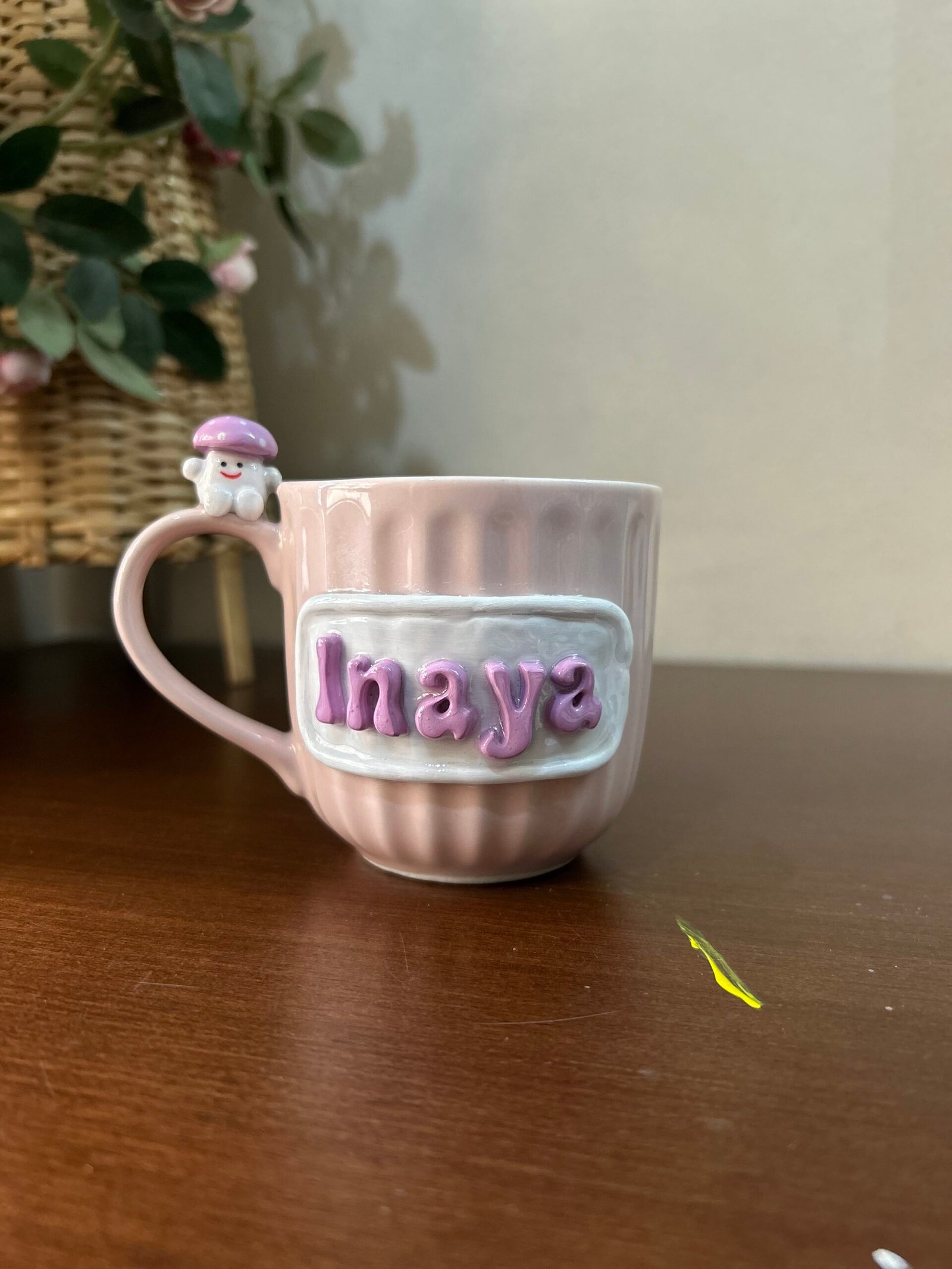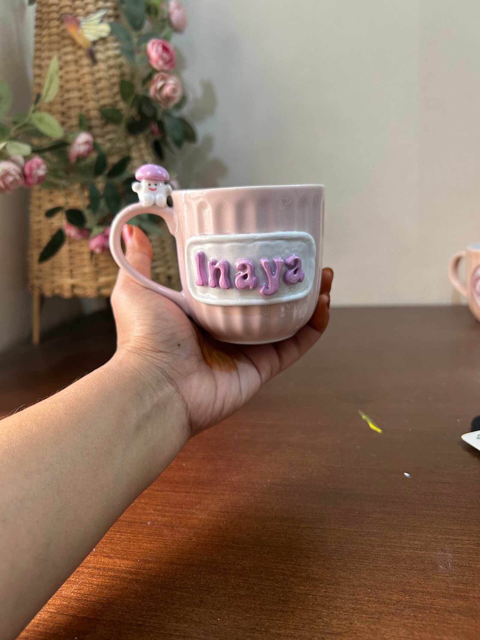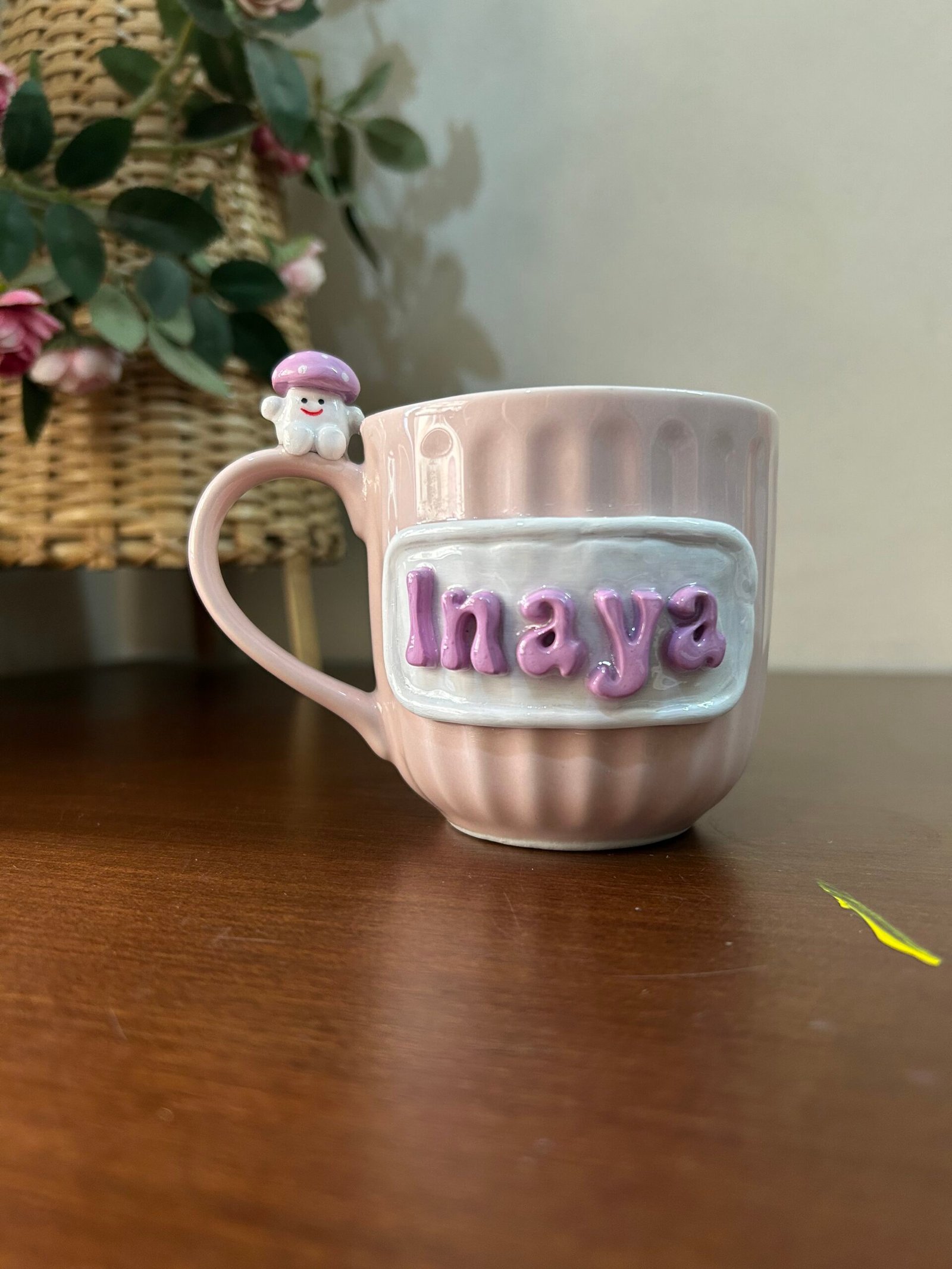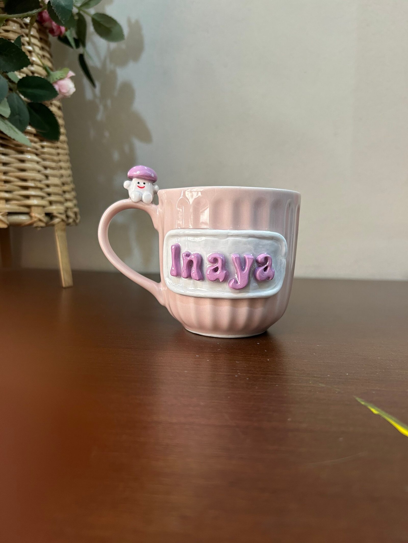 Meet the mug that’s as unique as you are! This isn’t just a cup; it’s a handcrafted piece of art designed to bring a smile to your face with every sip. Featuring a beautifully textured, ribbed ceramic body in a soft blush pink, this mug is elevated by a custom 3D nameplate and a tiny mushroom friend perched right on the handle.
